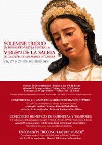 El de este año será el primer Triduo a Nuestra Señora la Virgen de la Saleta que se celebre en el lugar donde recibe culto desde el pasado mes de mayo. Los días 26, 27 y 28 la Iglesia de San Andrés de Zamora acogerá la celebración de este culto instaurado por las religiosas del Monasterio de Santa Clara a mediados de siglo, y que vino a sustituir el tradicional Novenario. El viernes y el sábado comenzará a las 19:30 horas y el domingo a las 12 del mediodía. Además se ha programado una conferencia sobre Ramón Álvarez para el miércoles 24 y un concierto benéfico de cornetas y tambores para el sábado 27 en el patio del Seminario.