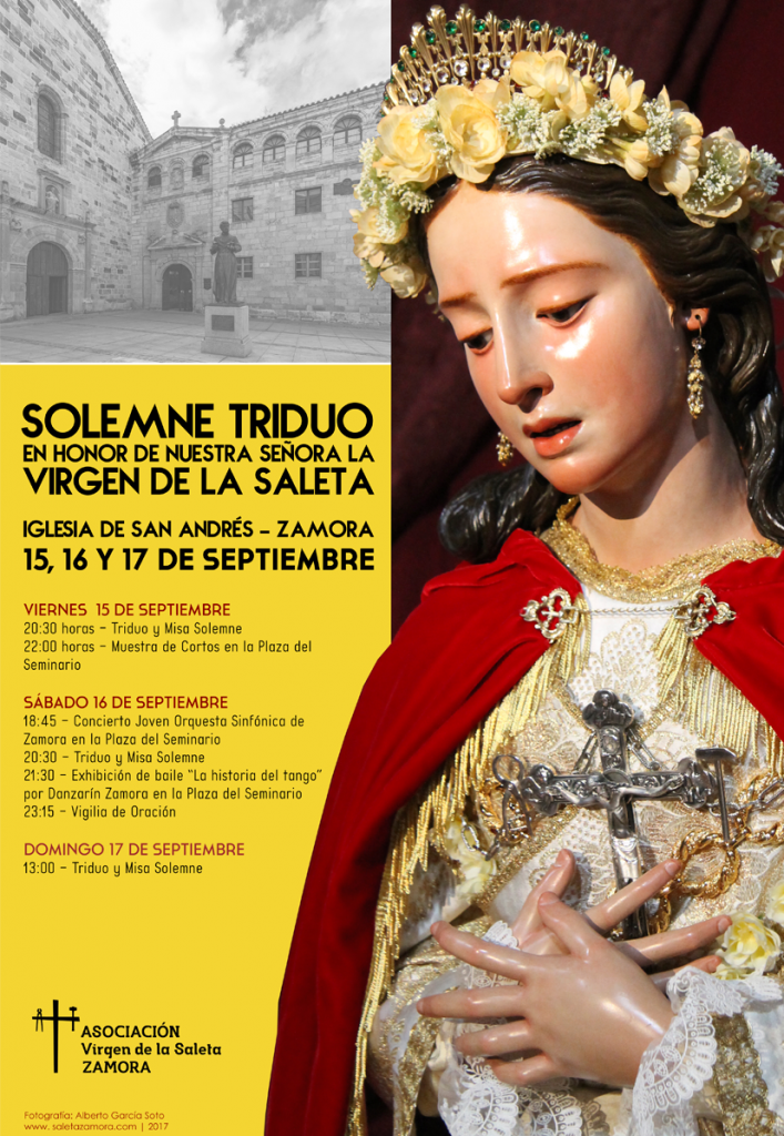 La Asociación de la Virgen de la Saleta muestra desde estas líneas su agradecimiento al Seminario Diocesano San Atilano, al Excelentísimo Ayuntamiento de Zamora, a la Joven Orquesta Sinfónica de Zamora, al Grupo Danzarín, a La Cueva del Jazz y a cuantas personas y organizaciones colaborarán para hacer posible la celebración del Triduo 2017.