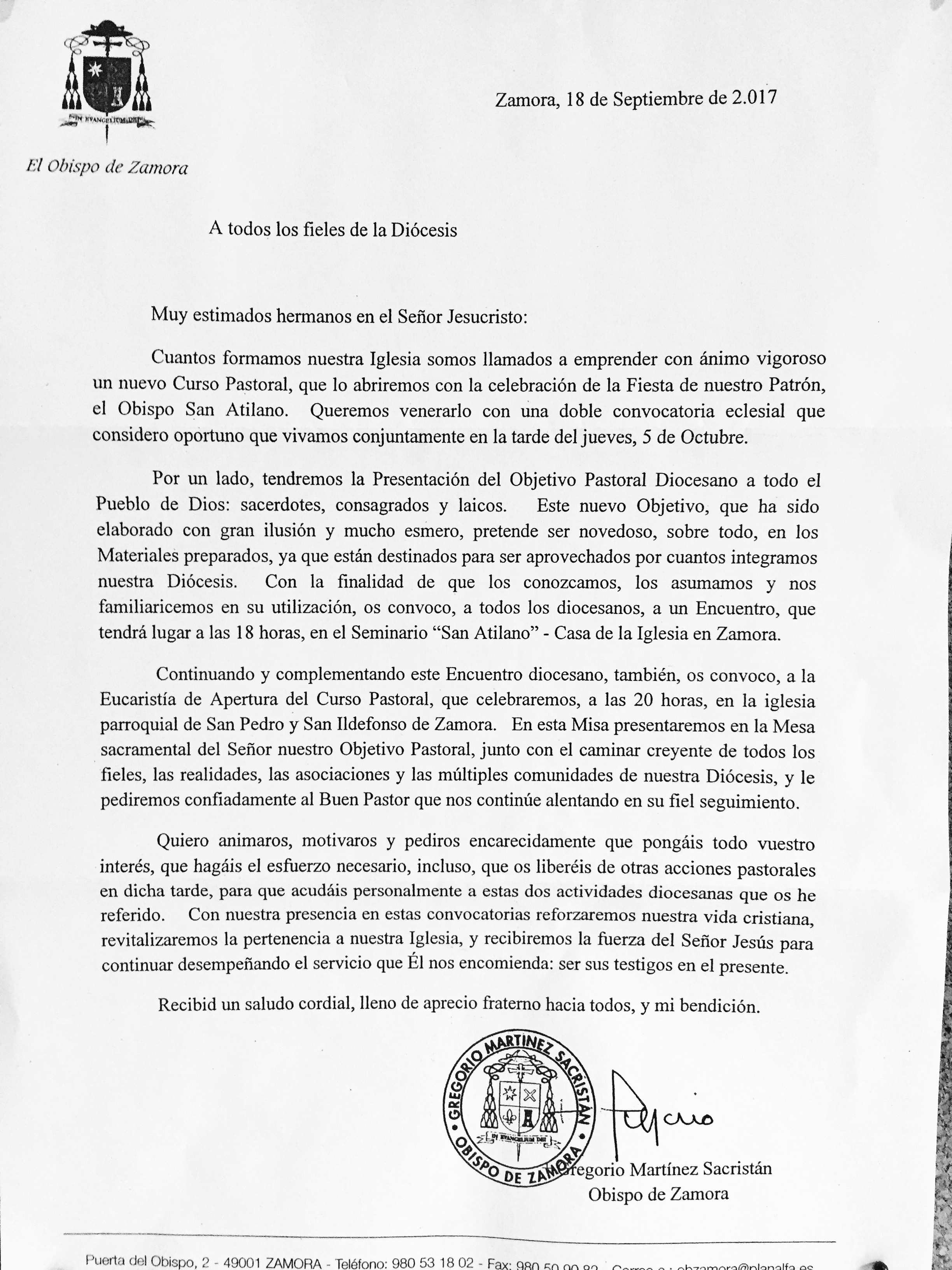 El próximo jueves 5 de octubre, Fiesta del Patrón de la Diócesis, San Atilano, se celebrará, como es habitual, la Eucaristía de Apertura del Curso Pastoral que presidirá el obispo, Gregorio Martínez Sacristán. Tendrá lugar a las 20 horas en la iglesia de San Ildefonso.