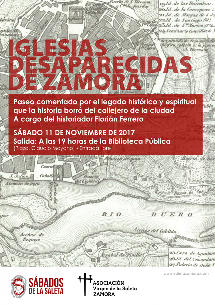 El próximo sábado 11 de noviembre tendrá lugar la primera edición del nuevo curso de los “Sábados de la Saleta”, iniciativa del área “diálogo fe-cultura” de nuestra Asociación. Con formato de conferencia itinerante la actividad llevará por título “Iglesias desaparecidas de Zamora: paseo comentado por el legado artístico y espiritual que la historia borró del callejero de la ciudad” y correrá a cargo del historiador Florián Ferrero.