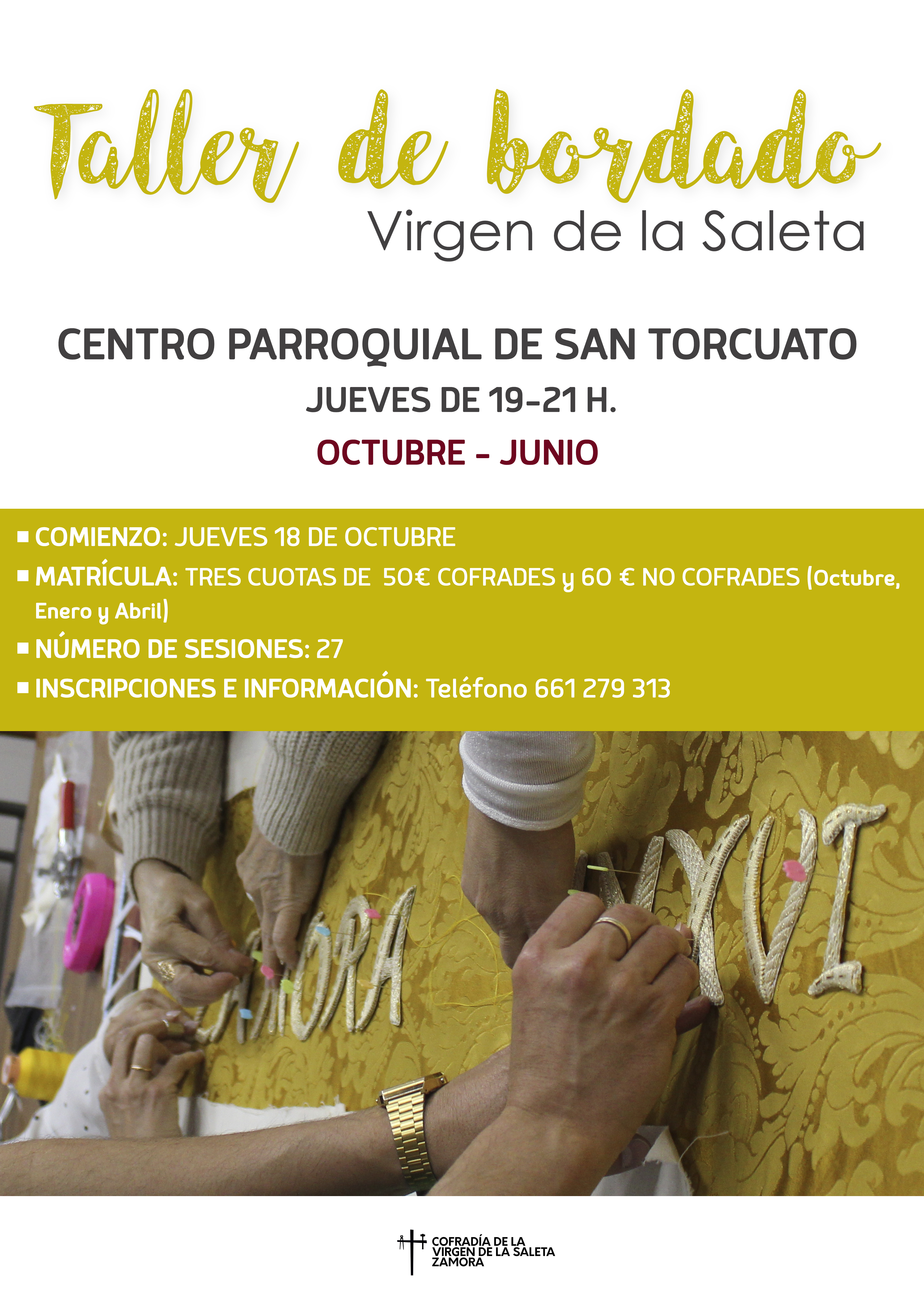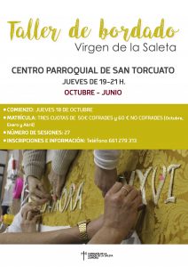 El próximo jueves 18 de octubre arrancará la segunda edición del Taller de Bordado “La Saleta”, creado el año pasado por nuestra Cofradía con buena aceptación. Este taller está dirigido a todas aquellas personas, cofrades o no, interesadas en aprender las técnicas básicas del bordado con hilo d