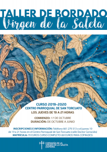 El Taller de Bordado “Virgen de la Saleta” abre un nuevo curso -el tercero- y se convoca a todas aquellas personas, cofrades o no cofrades, que estén interesadas en el aprendizaje de una técnica -el bordado en oro a mano- prácticamente extinguida y que tanta importancia ha tenido en el patrimonio de la religiosidad popular de nuestro entorno.