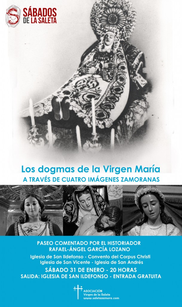 Esta primera cita, con formato de “paseo” visitando cuatro templos de la ciudad, se centrará en los cuatro dogmas marianos, sirviéndose para ello de cuatro imágenes de la Virgen María al culto en nuestra Diócesis: la Virgen del Amor Hermoso, en la iglesia de San Ildefonso, la Virgen del Tránsito, en el convento del Corpus Christi, Nuestra Madre de las Angustias, en la iglesia de San Vicente, y, finalmente, la Virgen de la Saleta, en la iglesia de San Andrés. Estas cuatro obras escultóricas, que atesoran juntas siglos de historia y devoción, servirán para ilustrar, por este orden, los dogmas de la Inmaculada Concepción, la Asunción, la Maternidad Divina y la Virginidad de María. Las explicaciones correrán a cargo del historiador Rafael-Ángel García Lozano.