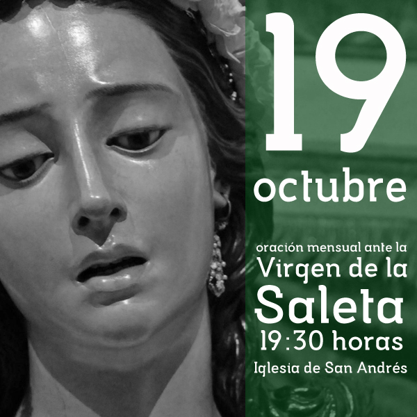 Cambio de hora en la oración de este mes 17 octubre, 2015 Sin categoría Con motivo de la celebración de la Misa en la iglesia San Andrés a las 20 horas, la oración ante la Virgen de la Saleta de cada día 19 se adelantará en esta ocasión a las 19:30 horas.