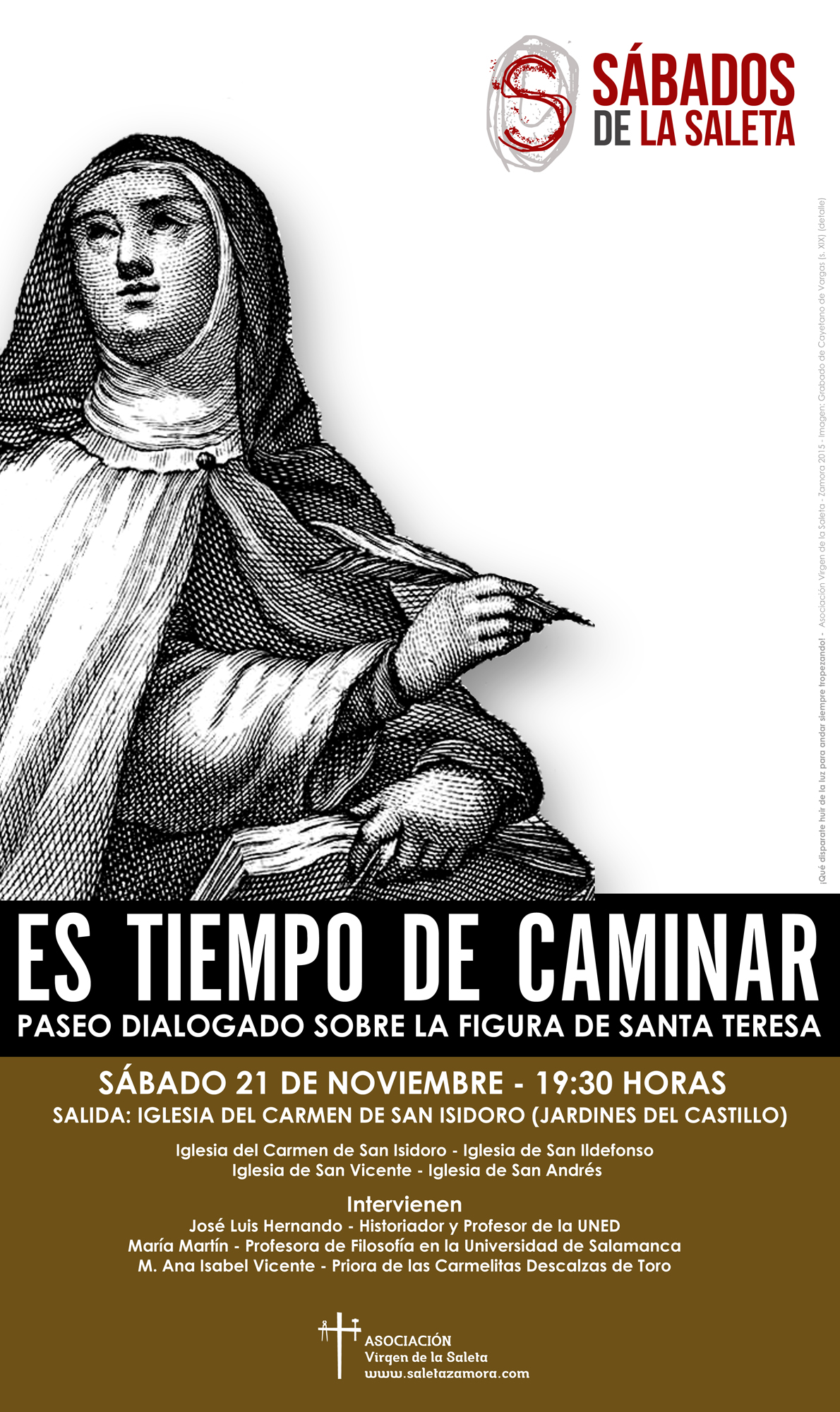 El próximo sábado 21 de noviembre organizaremos la tercera edición de la iniciativa titulada “Los sábados de la Saleta”, dentro del área Diálogo Fe-Cultura de nuestra Asociación. En esta ocasión la jornada estará centrada en la figura de Santa Teresa de Jesús, en sus múltiples facetas.